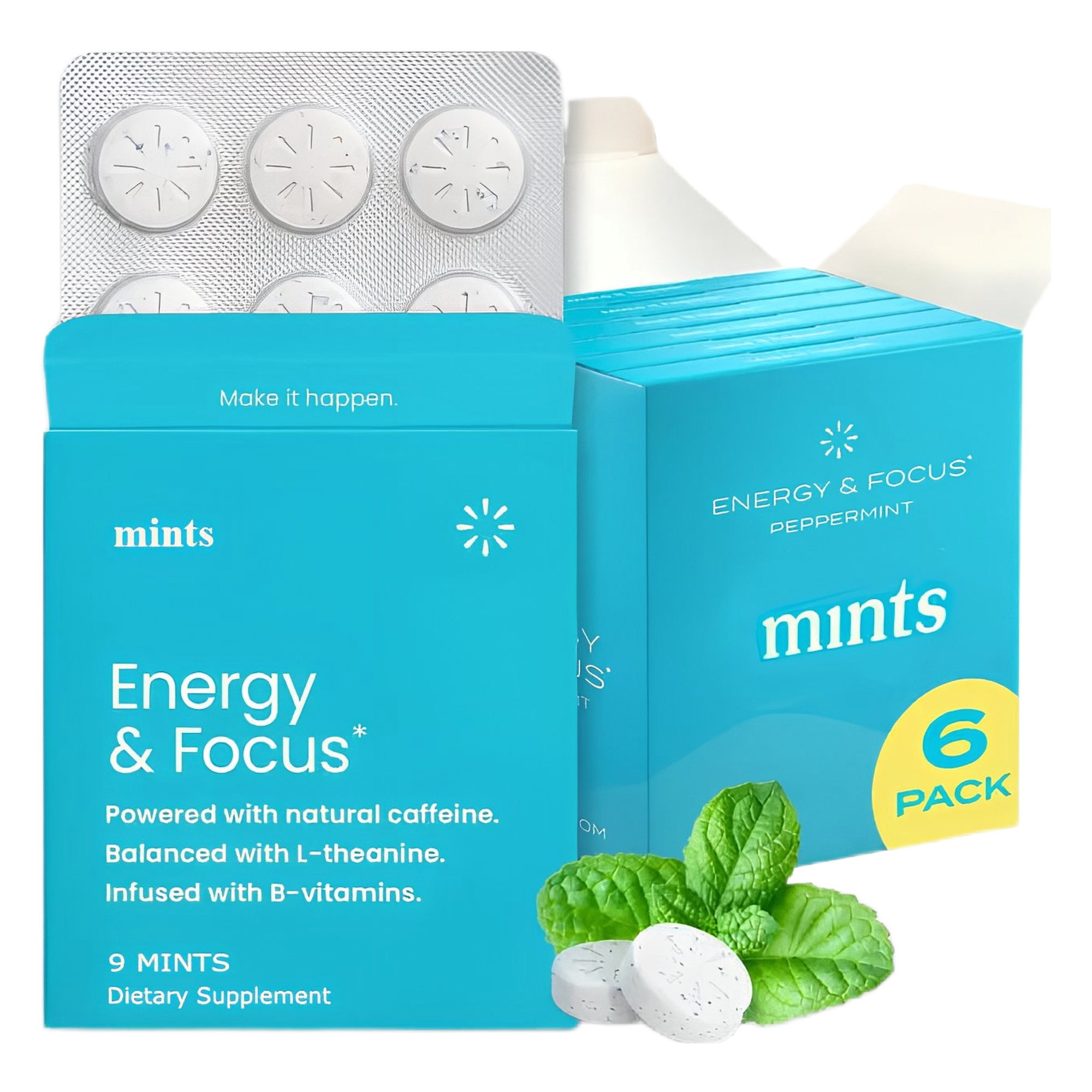 These are peppermint-flavored mints (9 per pack, sold in 6-packs) that double as a dietary supplement. Each mint contains 40mg of natural caffeine, paired with L-theanine, plus B6 and B12 vitamins. They’re sugar-free, aspartame-free, gluten-free, dairy-free, and vegan—designed for adults needing a quick, clean boost whether working, studying, exercising, or tackling busy days.